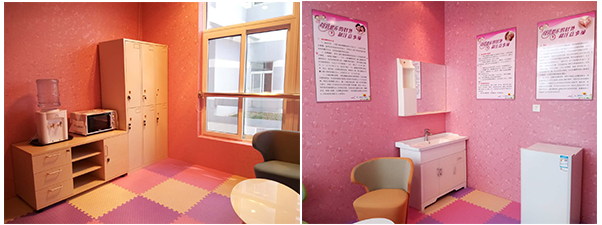 “愛(ài)心母嬰室”設(shè)置在活動(dòng)室二樓,面積11平方米,可容納4人同時(shí)哺乳。母嬰室內(nèi)設(shè)施完善,配備冰箱,飲水機(jī),儲(chǔ)物柜,微波爐,洗手池,宣傳標(biāo)識(shí)牌,軟座沙發(fā)等現(xiàn)代化設(shè)施,可以為哺乳媽媽們提供一個(gè)干凈衛(wèi)生、溫馨舒適、安全私密的哺乳環(huán)境。