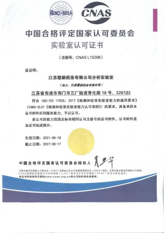 2021年8月18日,江蘇慧聚藥業(yè)有限公司通過審核,取得CNAS認(rèn)證證書。此次獲得CNAS審核,既是對(duì)分析實(shí)驗(yàn)室的技術(shù)實(shí)力及體系管理實(shí)力的認(rèn)可,也是慧聚藥業(yè)建設(shè)國際一流實(shí)驗(yàn)室道路上的關(guān)鍵一步。面向未來,分析實(shí)驗(yàn)室將繼續(xù)秉承“數(shù)據(jù)準(zhǔn)確、運(yùn)轉(zhuǎn)高效、行為公正、態(tài)度嚴(yán)謹(jǐn)”的質(zhì)量方針,嚴(yán)格按照法規(guī)要求、體系要求、國際標(biāo)準(zhǔn)、國內(nèi)標(biāo)準(zhǔn)認(rèn)真控制各檢測(cè)環(huán)節(jié),發(fā)揮各職能部門功能,完成各項(xiàng)檢測(cè)任務(wù),以專業(yè)的技術(shù)支持,確保檢測(cè)報(bào)告的準(zhǔn)確及時(shí),持續(xù)提升客戶滿意度。
